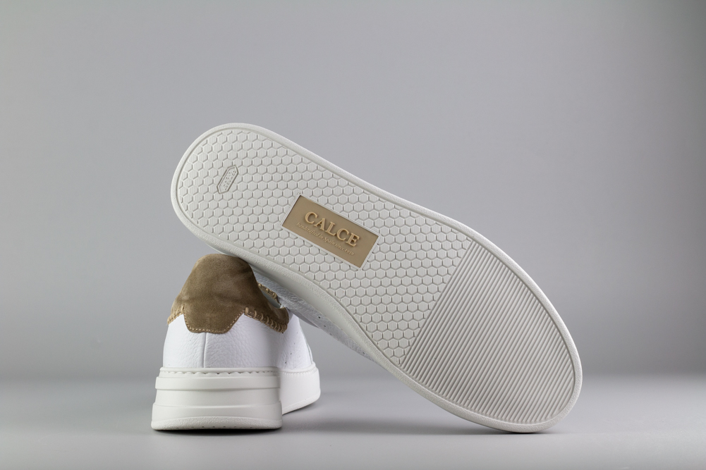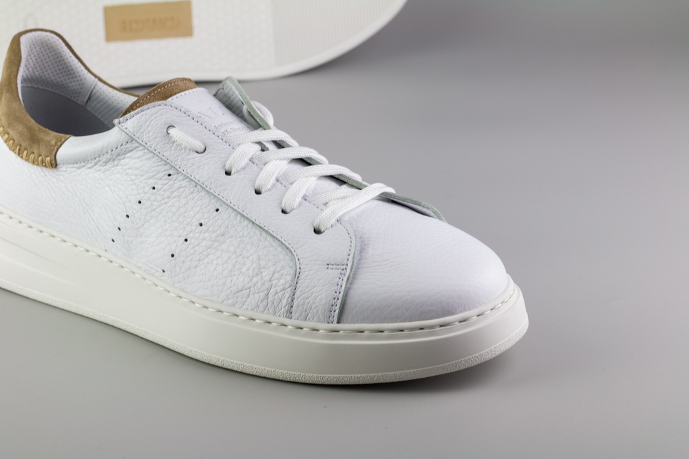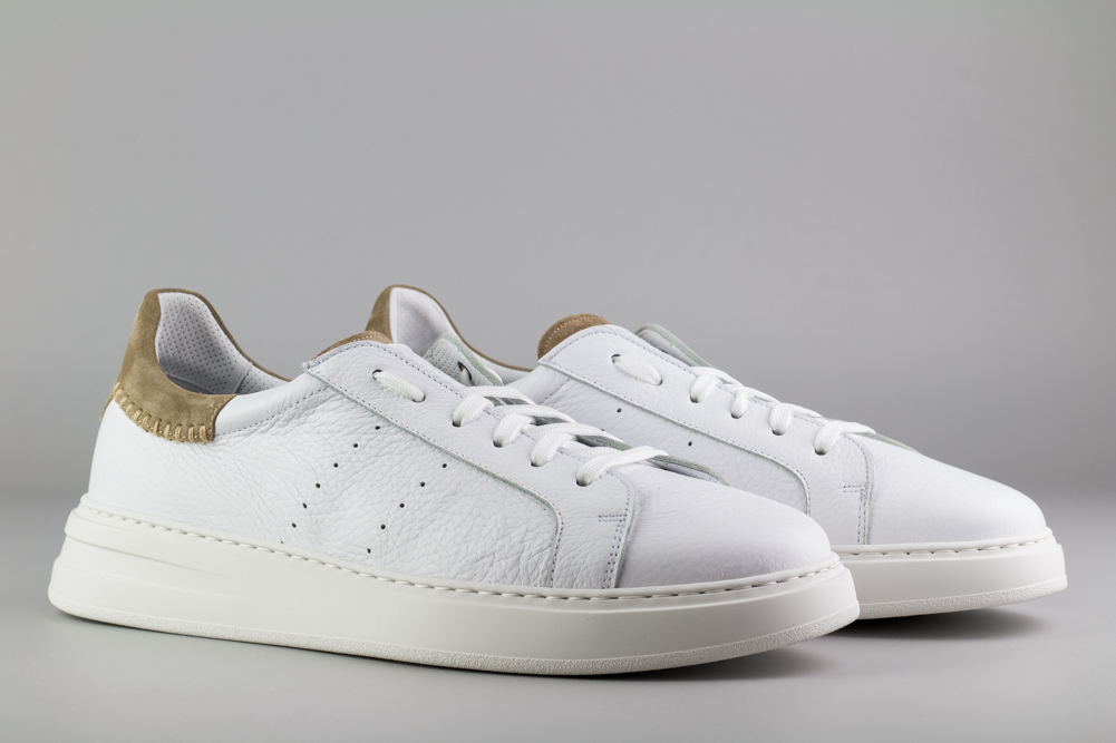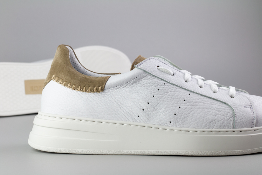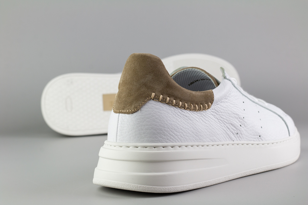 Piel natural en color blanco con grano visible que aporta textura y resistencia. Detalle de talón en ante beige y acabados cuidados para un look premium y atemporal.