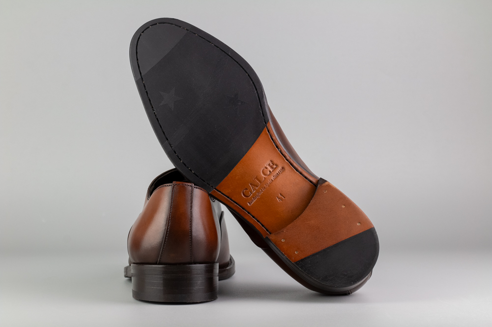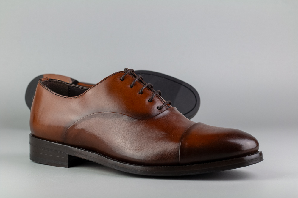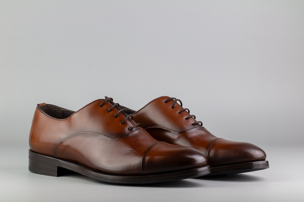 Zapato de cordones tipo Oxford en piel color brandy, confeccionado artesanalmente en España.