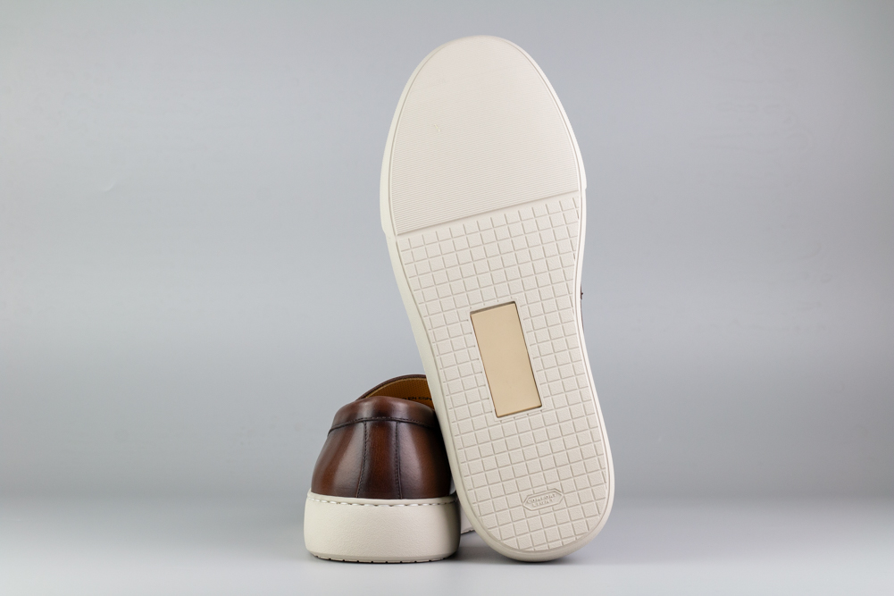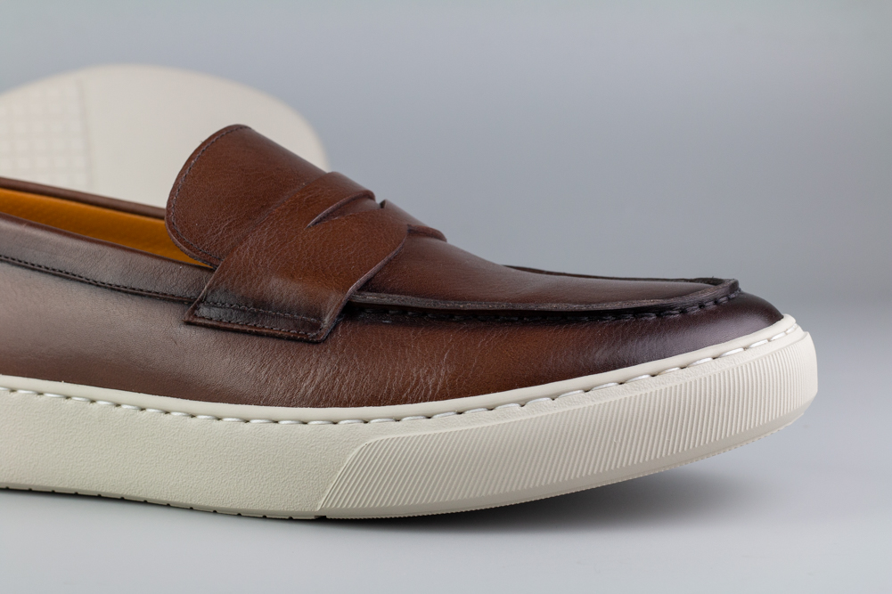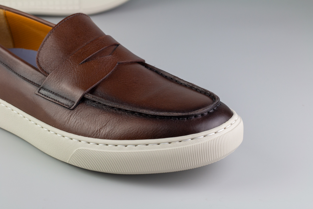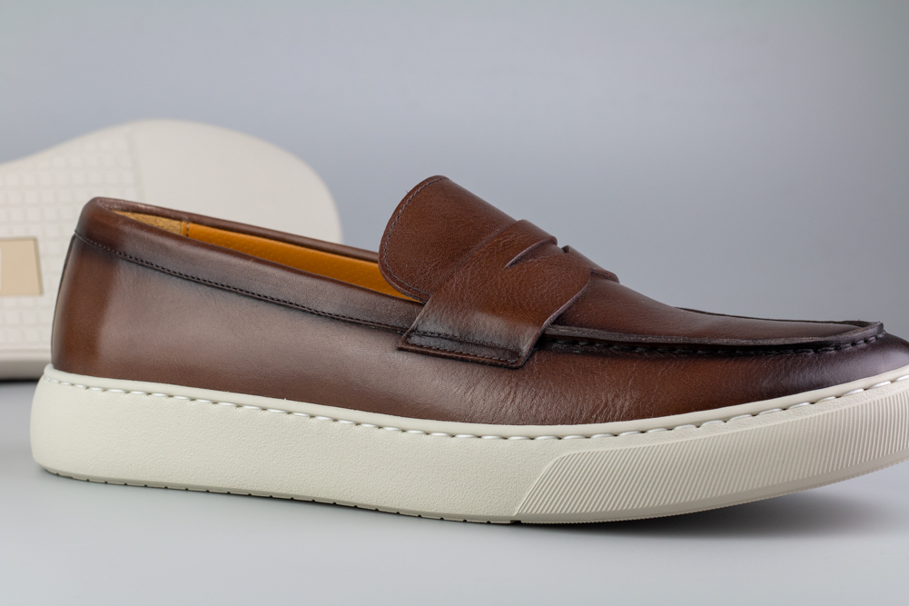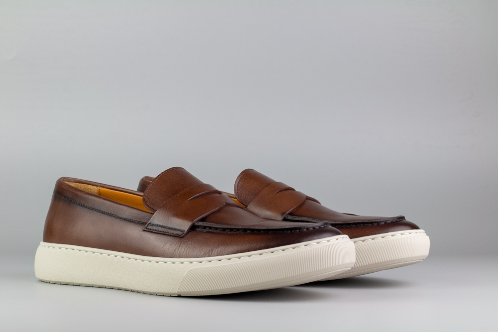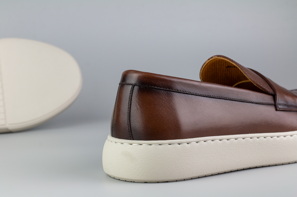 Mocasín de caballero en piel marrón con suela clara, confeccionado artesanalmente en España.