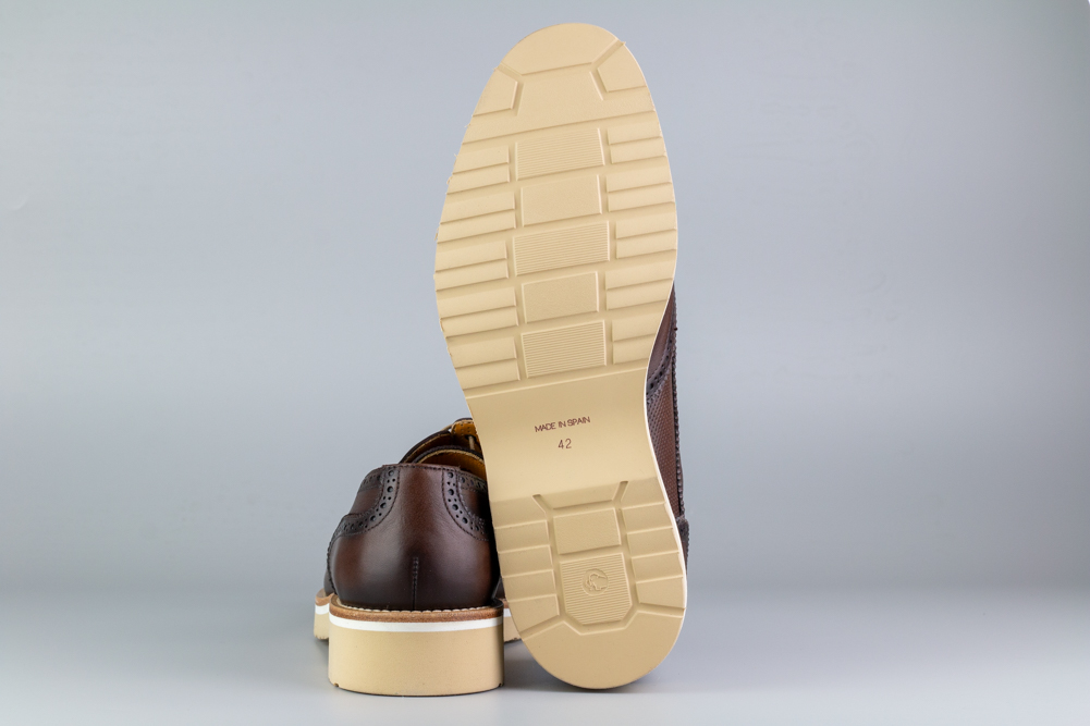 Zapato blucher de caballero en piel marrón con detalles brogue y suela clara de volumen.