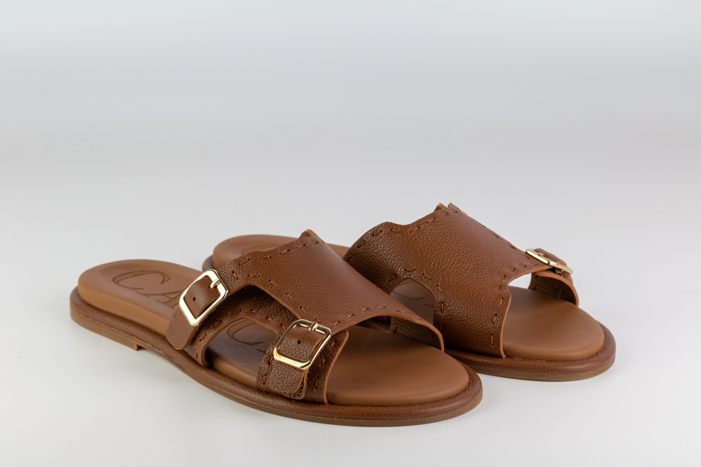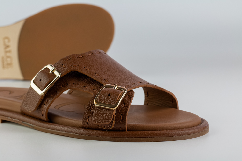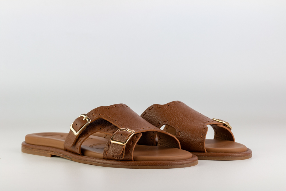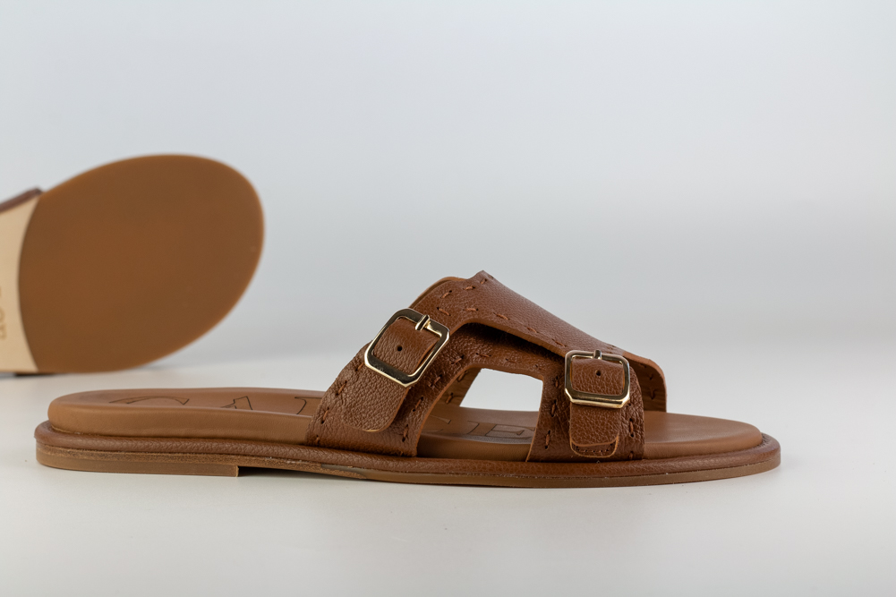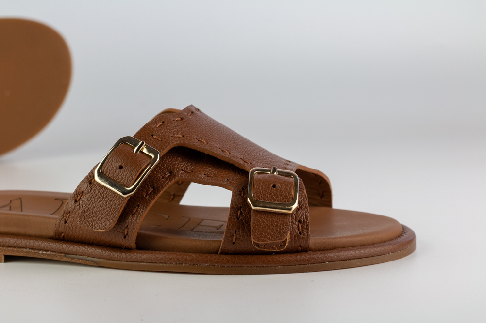 Sandalia plana de mujer en piel color cuero, diseñada para acompañar el verano con ligereza, naturalidad y carácter. Su diseño abierto con doble hebilla combina funcionalidad y estética en una pieza cómoda, versátil y atemporal.