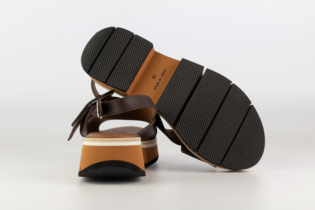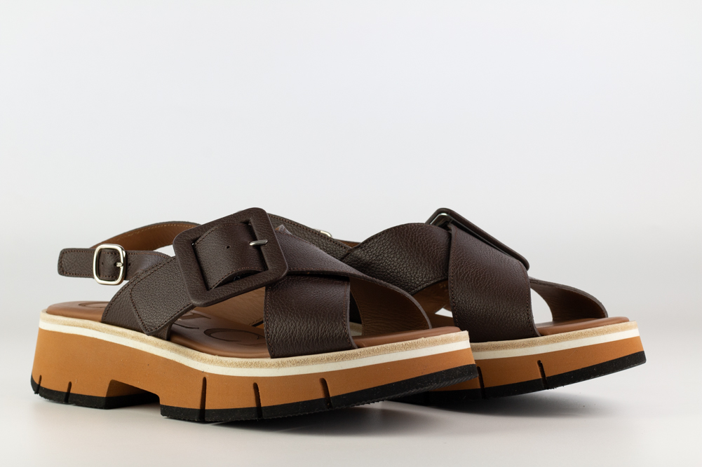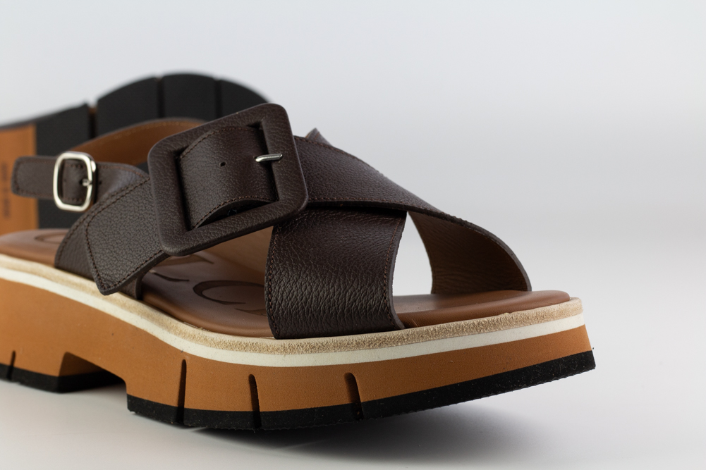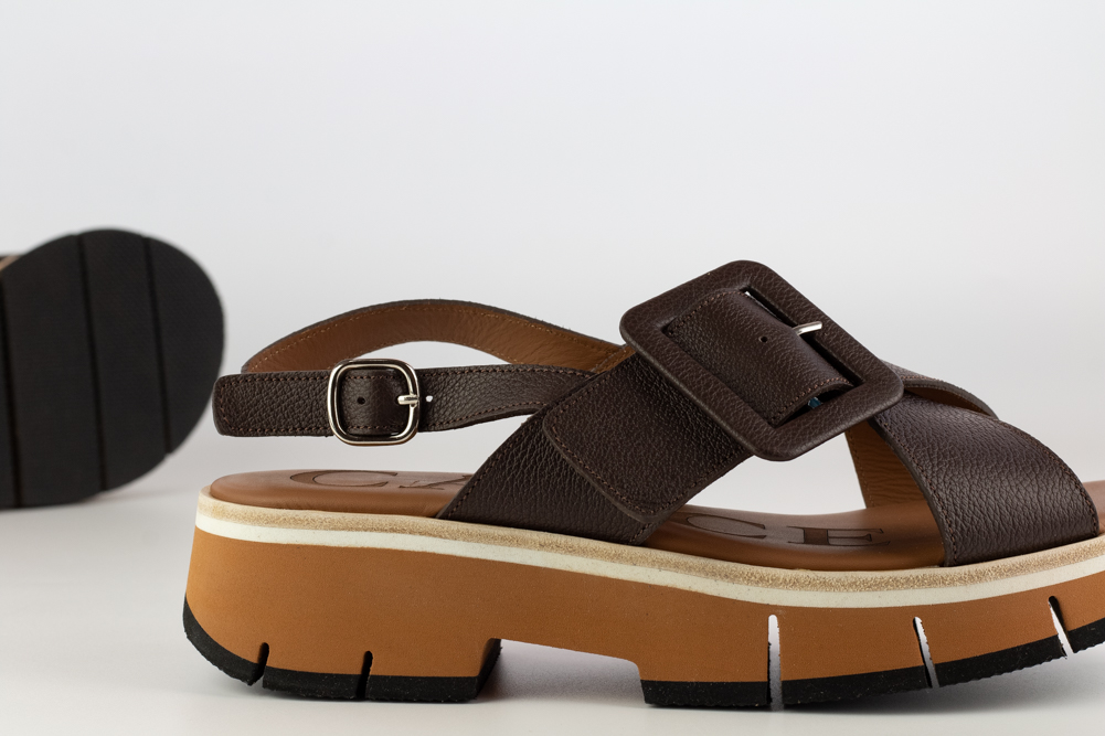 Sandalia de mujer en piel marrón con pala cruzada, gran hebilla decorativa y suela de volumen. Un diseño contemporáneo y con carácter, pensado para quienes buscan una sandalia cómoda, actual y con presencia en los looks de primavera y verano.