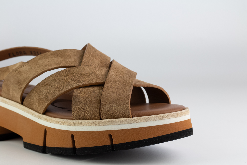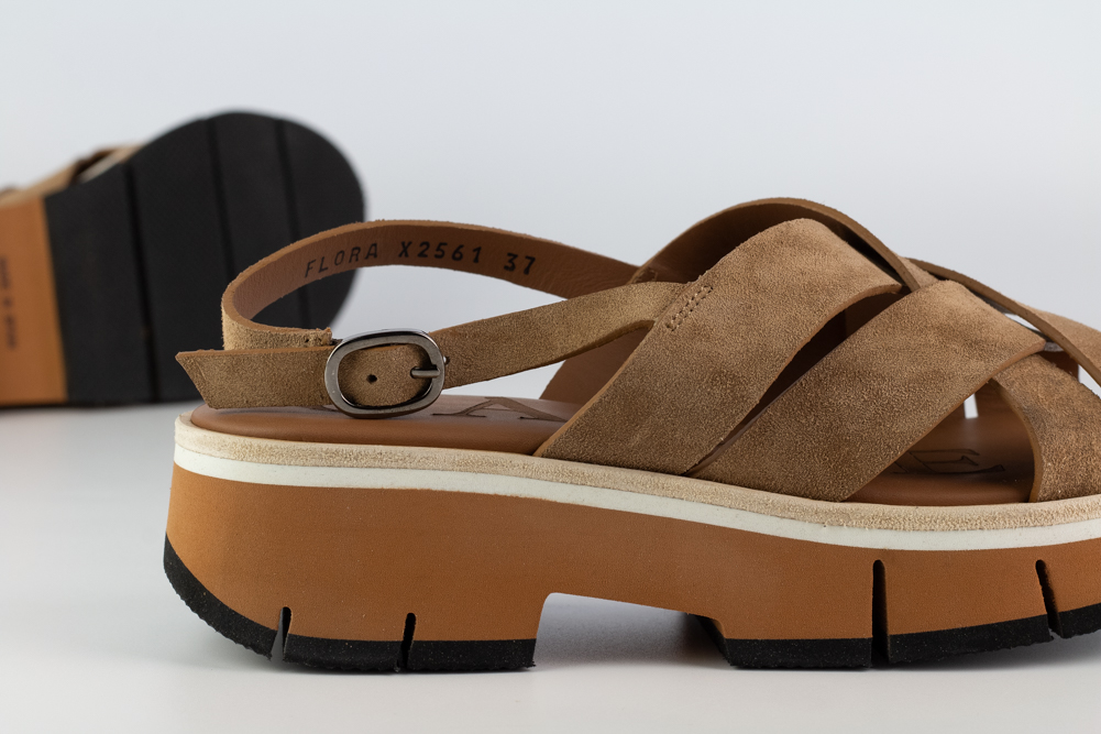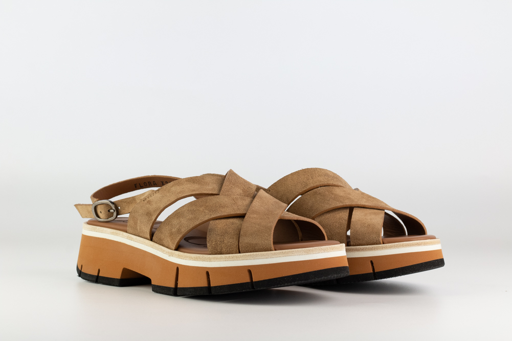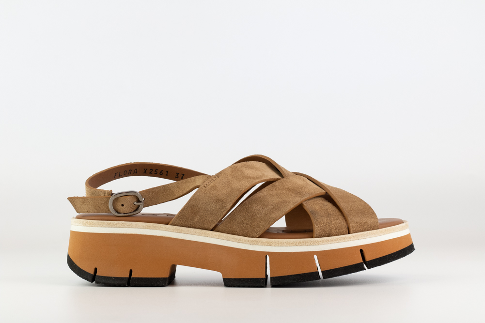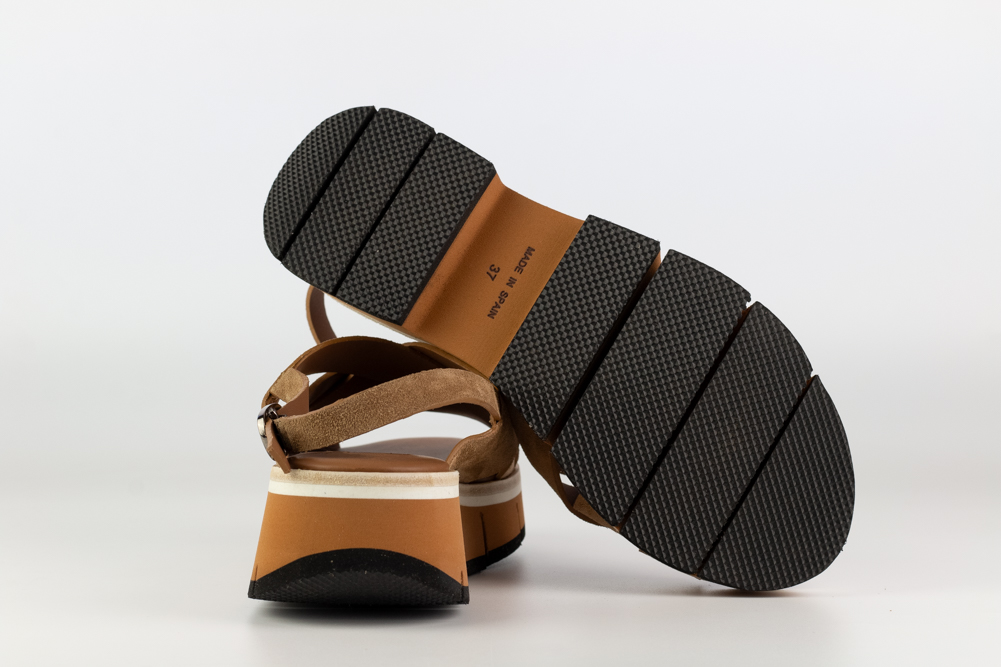 Sandalia de mujer en serraje marrón con tiras anchas cruzadas y suela de plataforma. Un diseño contemporáneo, cómodo y versátil, pensado para acompañar los looks de primavera y verano con una imagen natural y actual.